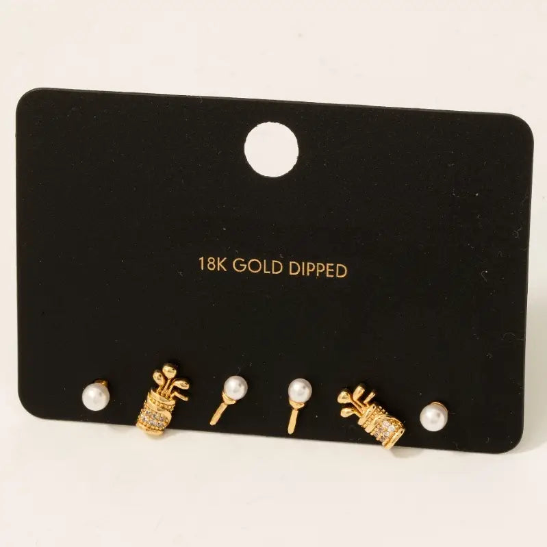 A charming blend of sporty chic and timeless elegance, The Country Club Stud Set features a trio of 18K gold–dipped studs designed for the girl who loves a polished look on and off the course. With dainty pearl studs, sparkling golf-club bags, and mini tee-inspired accents, this set brings a playful yet sophisticated touch to your everyday style. Perfect for mixing, matching, and showing off your inner golf babe with a luxe twist.