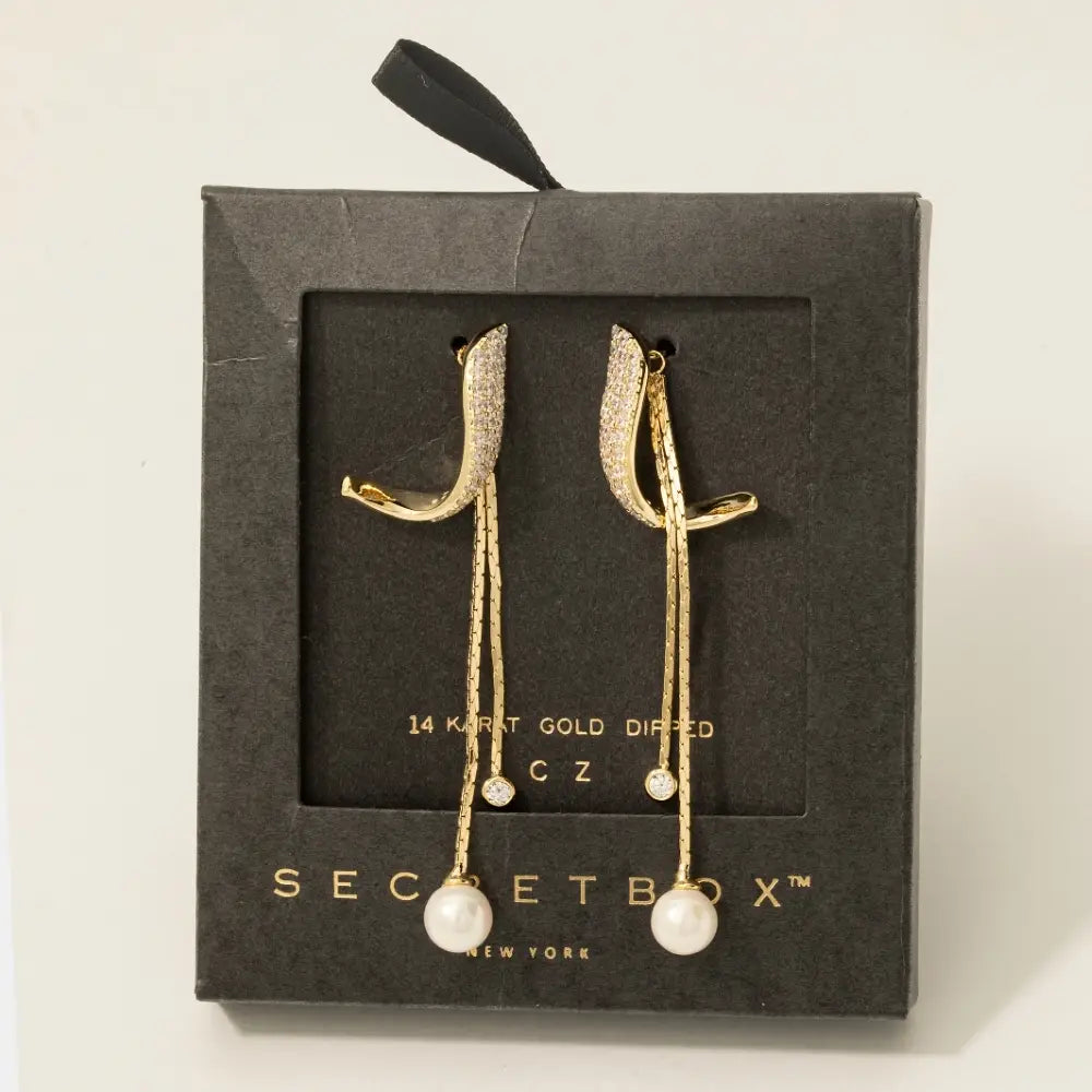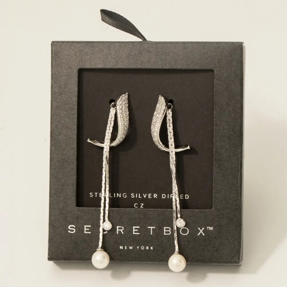 Illuminate every look with the Lumière Drop Earrings — a perfect blend of timeless elegance and modern sophistication. Crafted with a graceful curved silhouette, these earrings feature two delicate chain drops adorned with sparkling cubic zirconia accents and finished with lustrous faux pearls. Available in 14K gold-dipped or sterling silver-dipped finishes, they effortlessly transition from day to night, adding a refined touch of glow to any outfit.