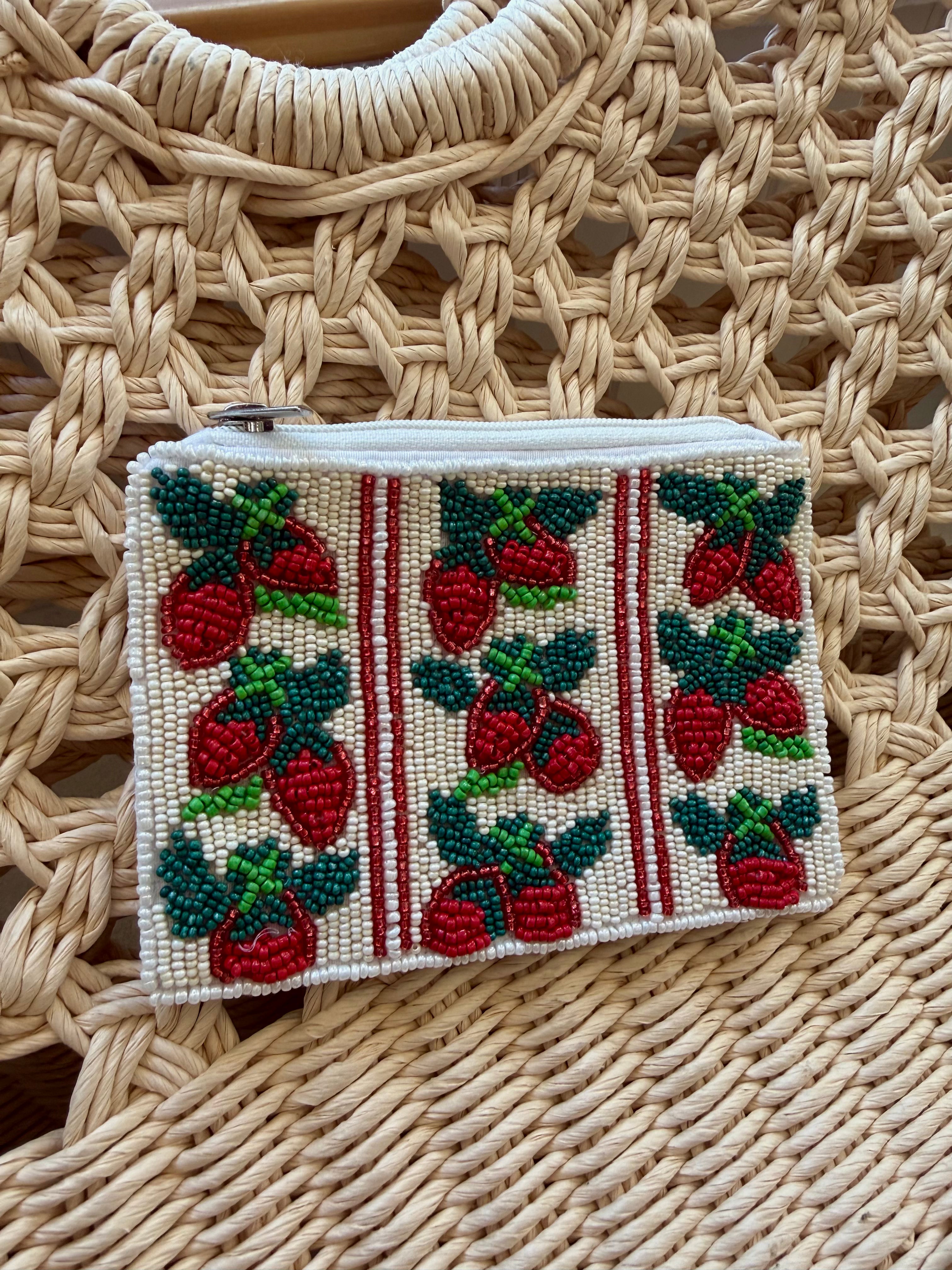 Bold with a playful edge. The Red Pepper Beaded Zip Pouch features intricate hand-beaded red pepper motifs with lush green accents on a creamy white backdrop. Designed with a soft structure and secure zip closure, this statement pouch is perfect for everyday essentials, travel organization, or adding a pop of personality to your favorite tote. Fun, eye-catching, and effortlessly chic.