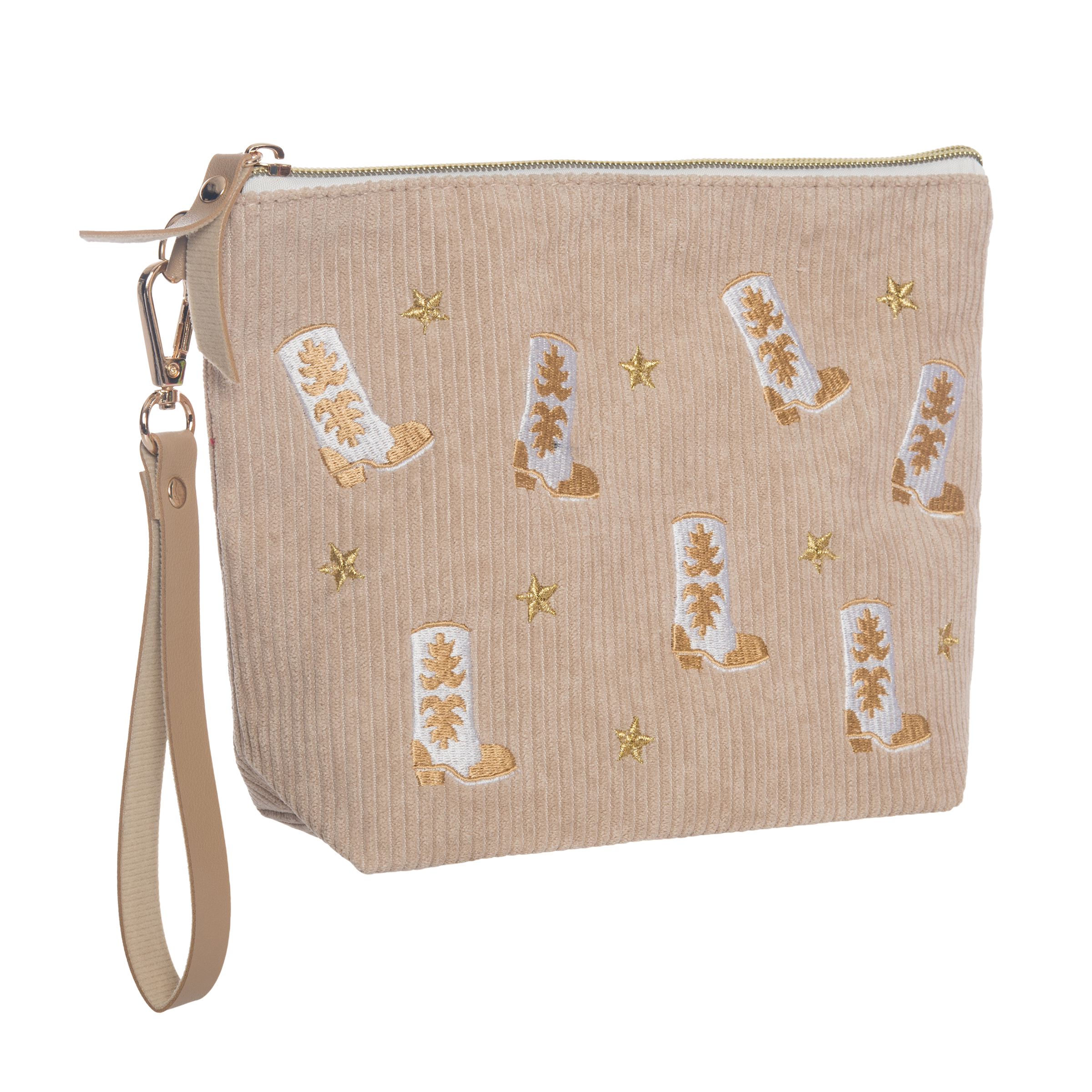 This beige corduroy wristlet features embroidered gold-and-white cowboy boots with tiny star accents — a playful yet polished accessory that carries your essentials in style. Perfect for concerts, coffee runs, or gifting your favorite cowgirl.