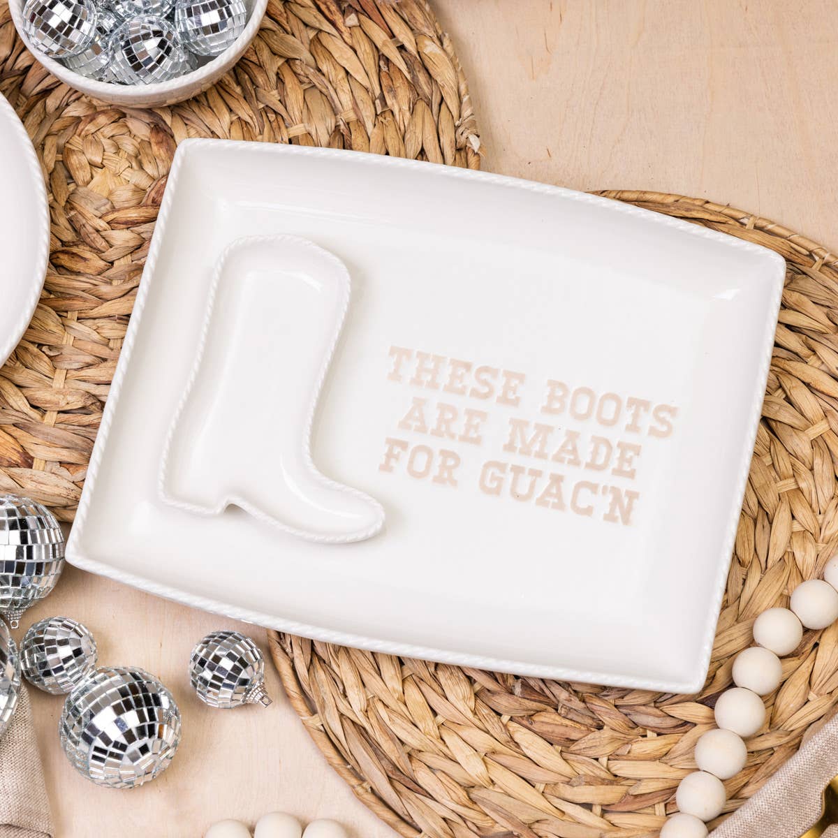 This charming ivory ceramic dish features a raised boot detail and embossed lettering that reads “These Boots Are Made for Guac’n.” Perfect for chips and dip, jewelry, or a touch of Western glam on your coffee table.