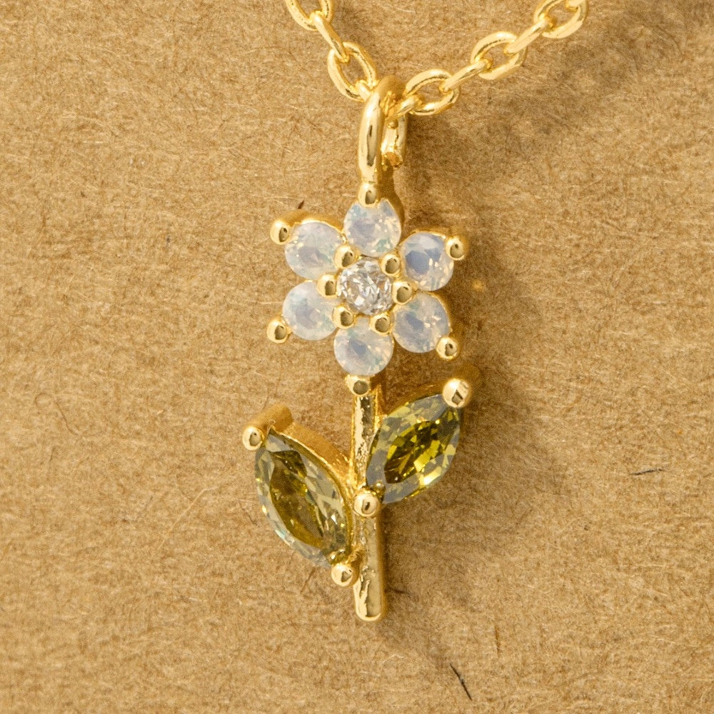 Soft, feminine, and effortlessly elegant, the Petite Bloom Necklace features a dainty floral pendant accented with luminous opalescent stones and delicate leaf detailing. Set on a fine gold-tone chain, this piece brings a subtle touch of nature-inspired charm with a refined, timeless finish.