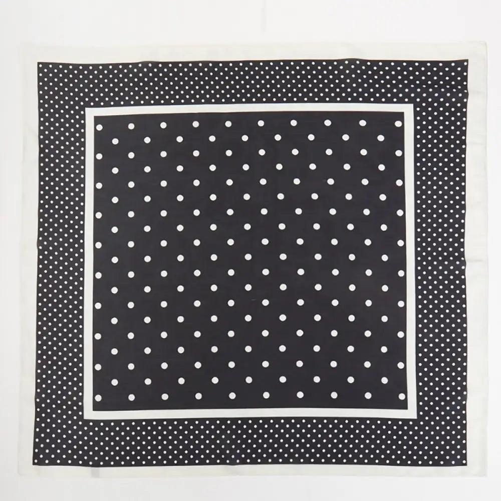 Timeless with a refined edge, the Black Label Dot Scarf is the definition of effortless sophistication. Designed in a rich black silk-feel fabric with delicate ivory polka dots and a subtle mixed-dot border, this piece brings dimension to a classic pattern.