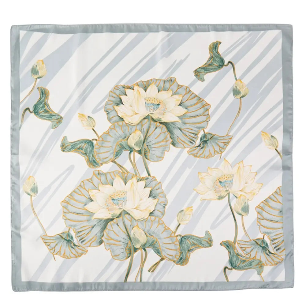 Soft, serene, and effortlessly refined inspired by delicate lotus blooms floating across a misty blue canvas with subtle golden accents.