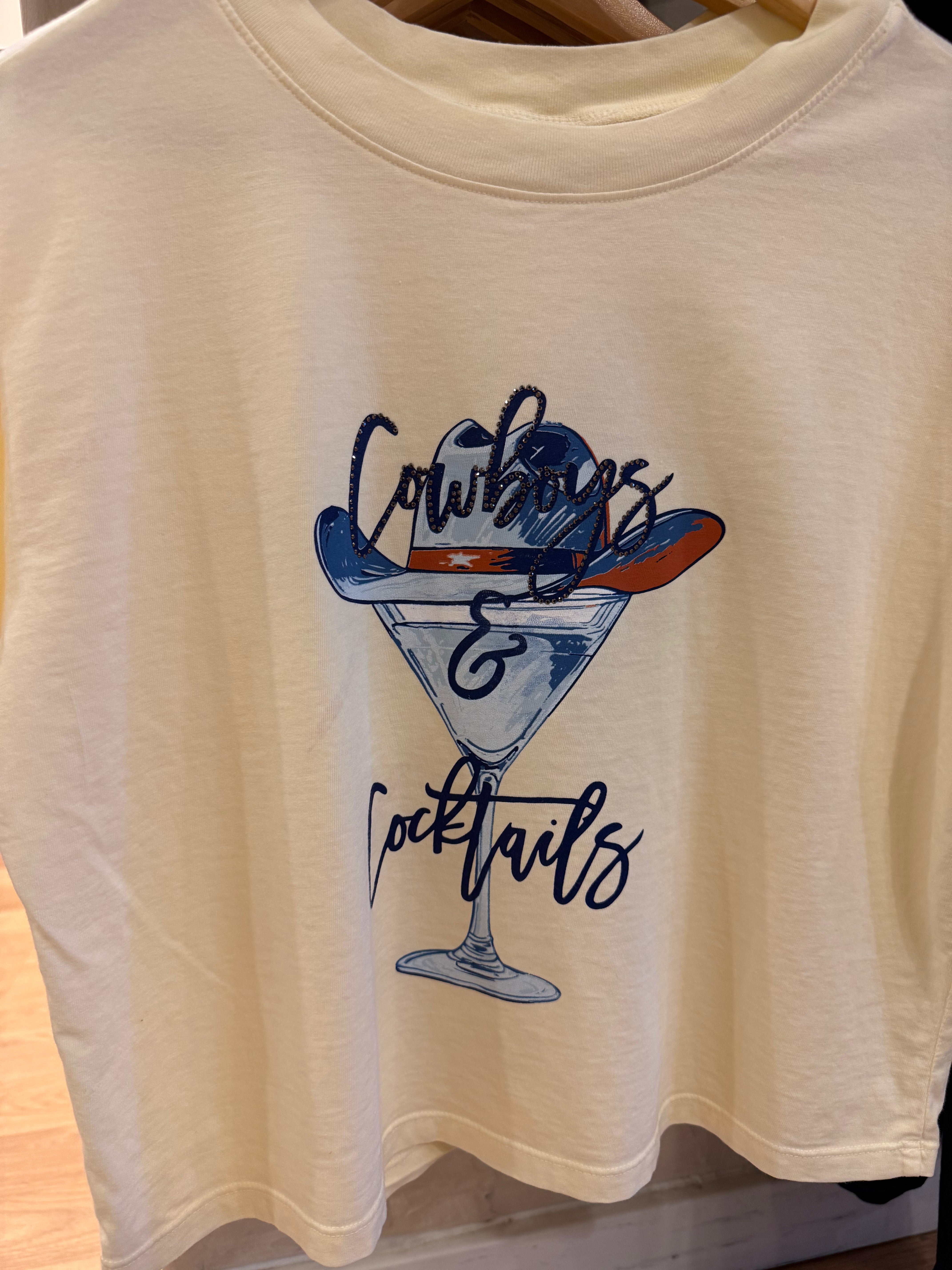 graphic topped with a classic cowboy hat—perfectly blending rodeo spirit with cocktail culture. Designed on a soft cream tee with a relaxed, flattering fit, it’s the ultimate statement piece for nights out, casual days, or weekend adventures.
