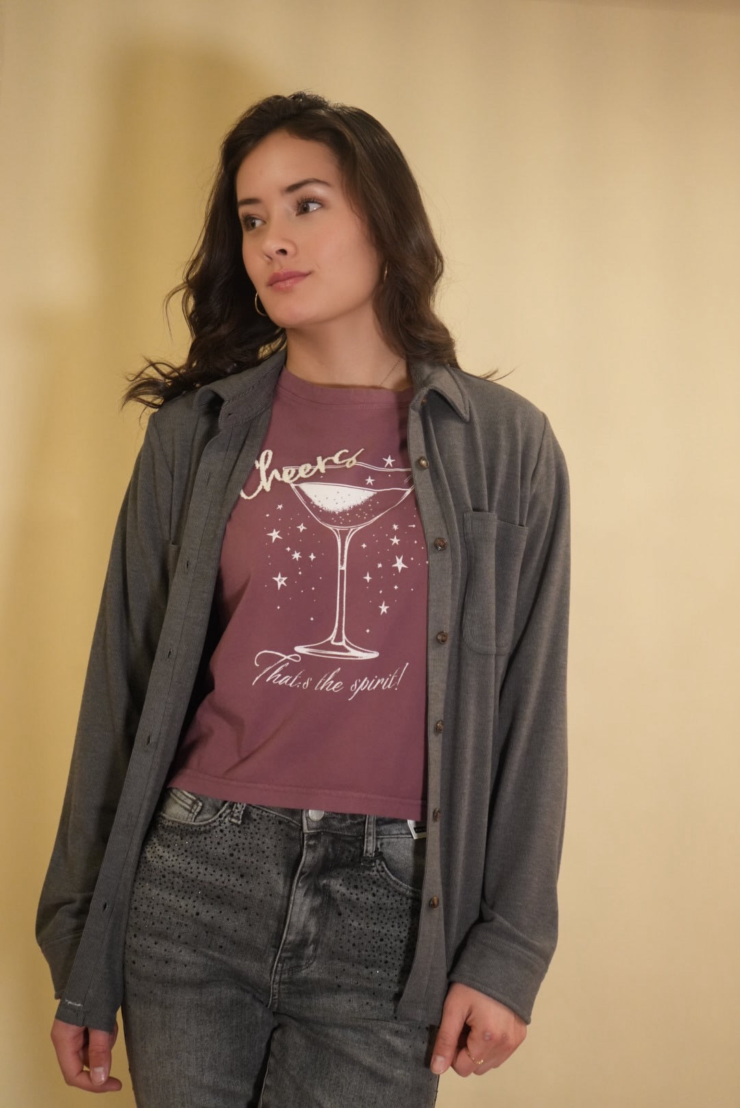 Cool, effortless, and endlessly versatile — The Durango Fog Button-Up is your new everyday essential. Crafted in a soft charcoal-gray fleece blend, this top combines the relaxed comfort of your favorite lounge piece with the structured silhouette of a button-down. Featuring dual chest pockets, a curved hem, and subtle dropped shoulders, it drapes beautifully whether worn open over a tank or buttoned for a cozy, polished look.