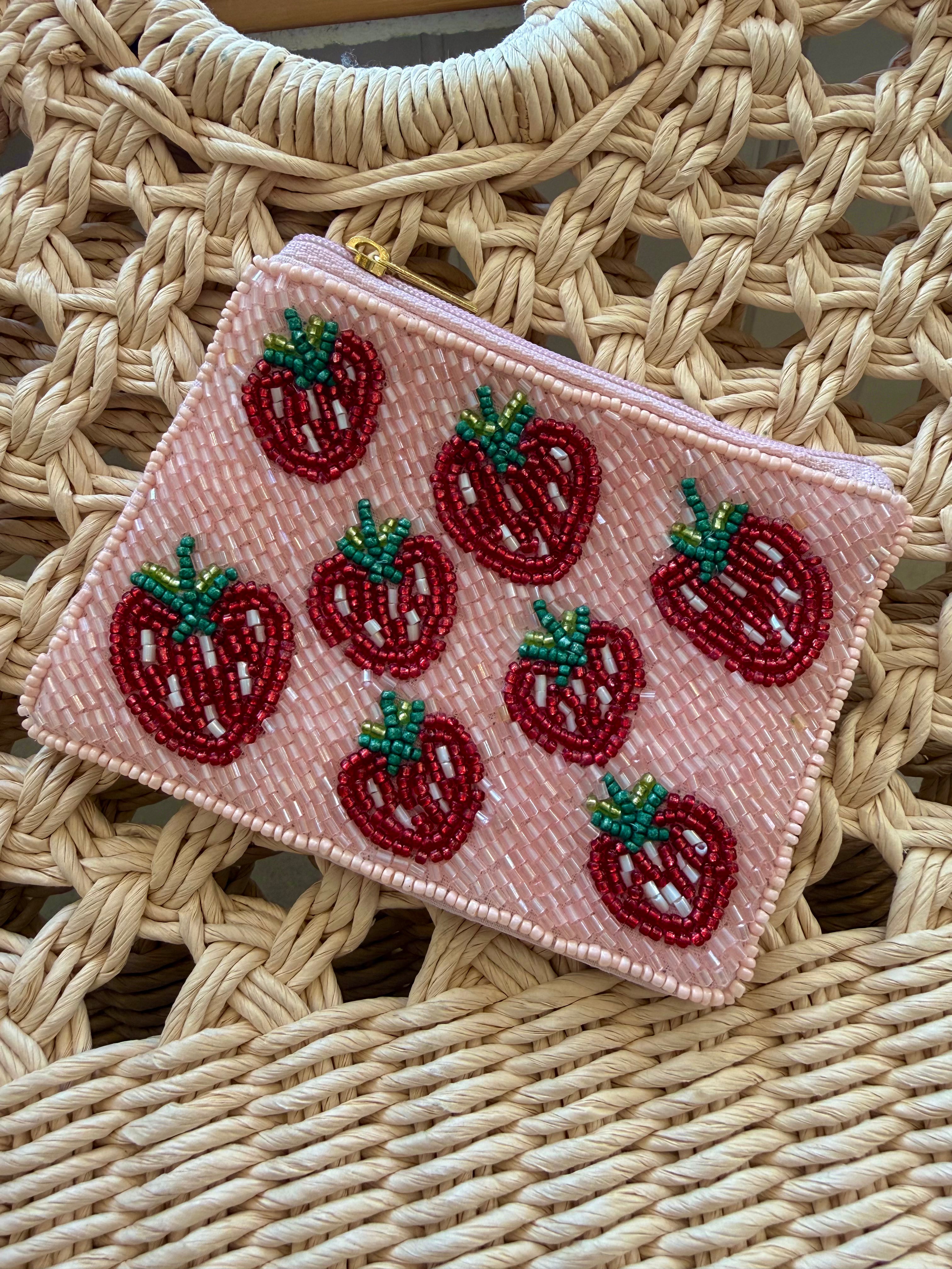 Sweet with a soft, feminine touch. The Blush Strawberry Beaded Zip Pouch features delicate hand-beaded strawberries with fresh green accents set against a blush pink background. Finished with a secure zip closure and intricate beadwork throughout, this charming pouch is perfect for everyday essentials, travel organization, or adding a playful pop to your favorite tote.