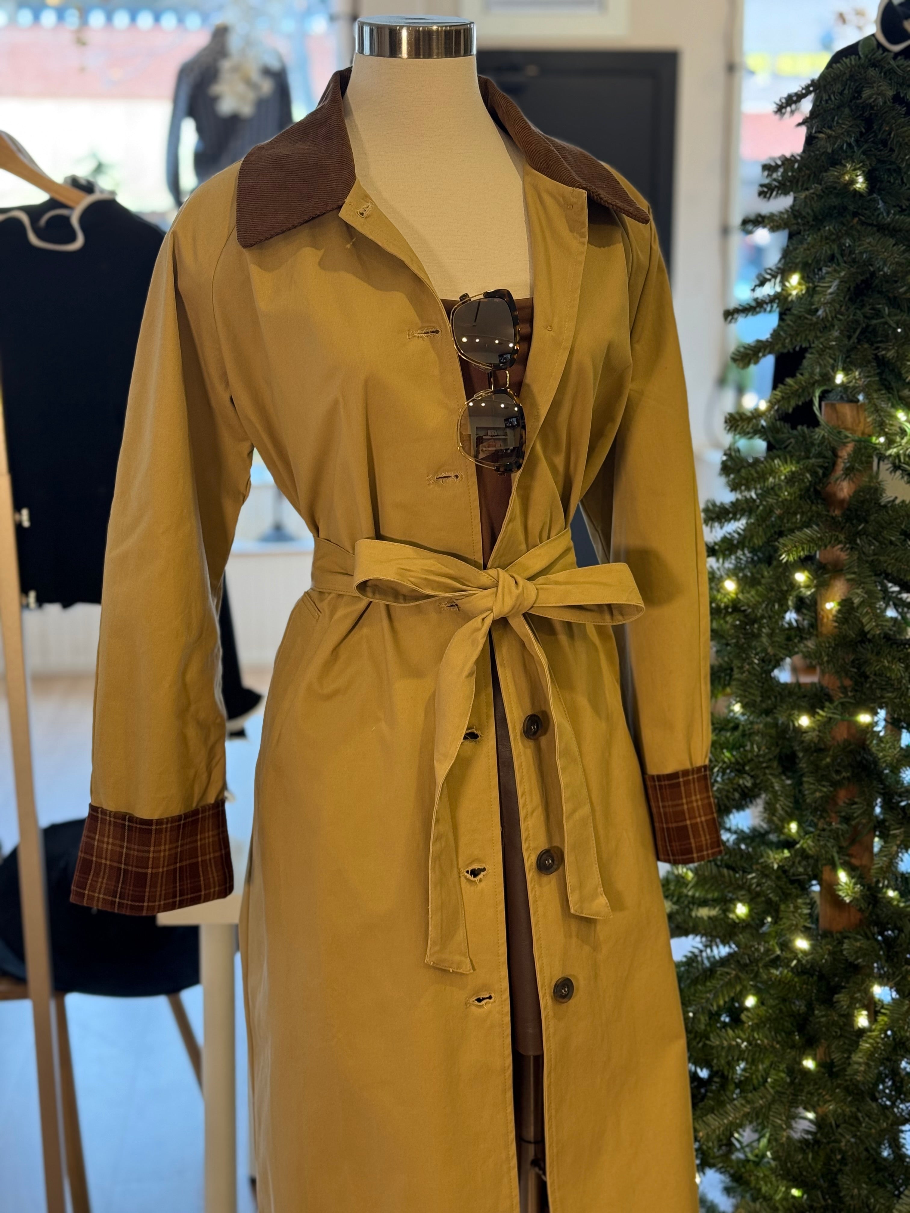 The Kensington Trench captures timeless sophistication with a modern twist. Crafted in a classic camel tone, this longline coat features plaid-lined cuffs, tortoise buttons, and a matching waist tie for a perfectly tailored silhouette. Its structured yet effortless design transitions seamlessly from office hours to weekend strolls, adding a touch of London-inspired polish to every look.
