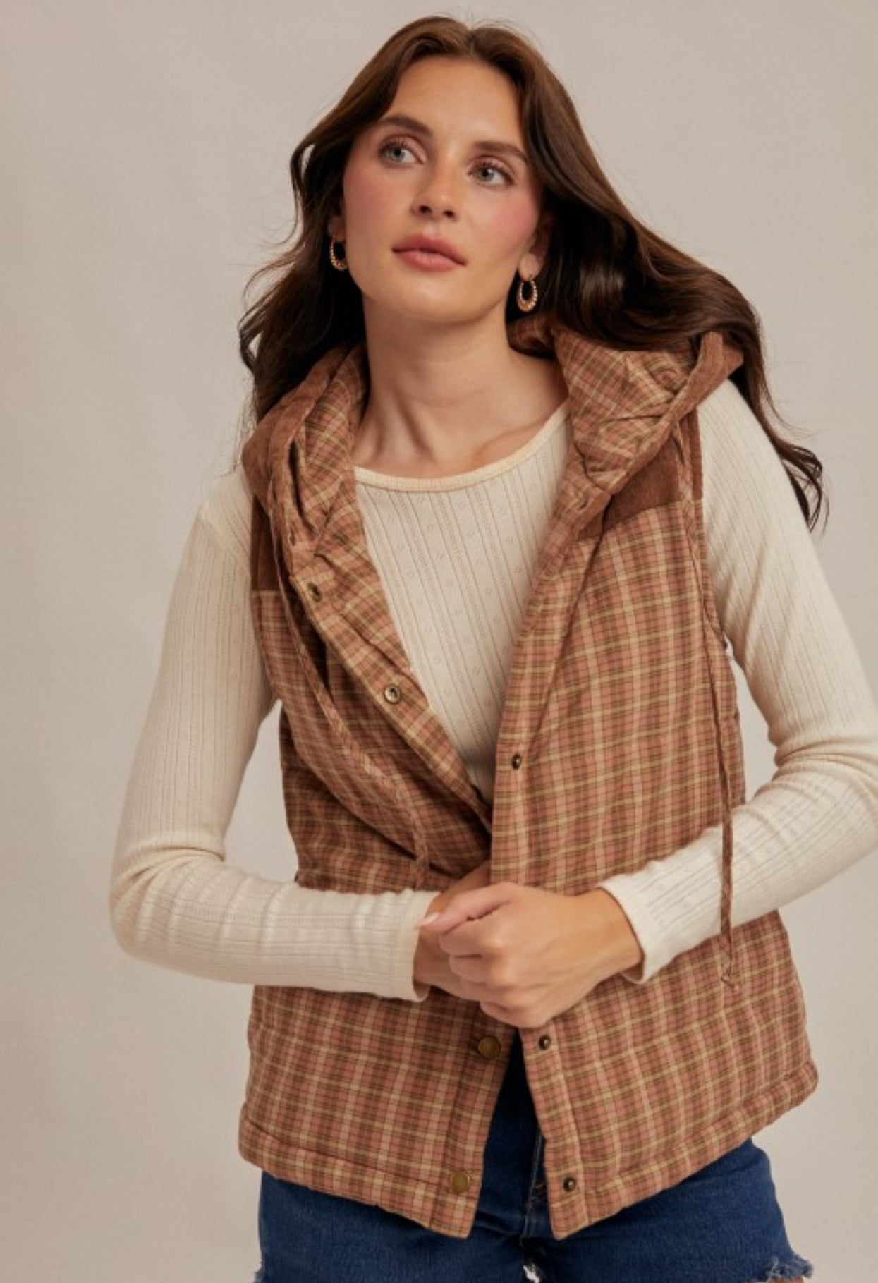 Wrap yourself in effortless warmth with the Rustic Charm Vest. Designed in a soft plaid quilt with earthy tones, this versatile layering piece features a cozy hood, snap-button closure, and a relaxed fit that pairs perfectly over your favorite knits or flannels. A blend of comfort and countryside chic, it’s the vest you’ll reach for from crisp mornings to fireside evenings.